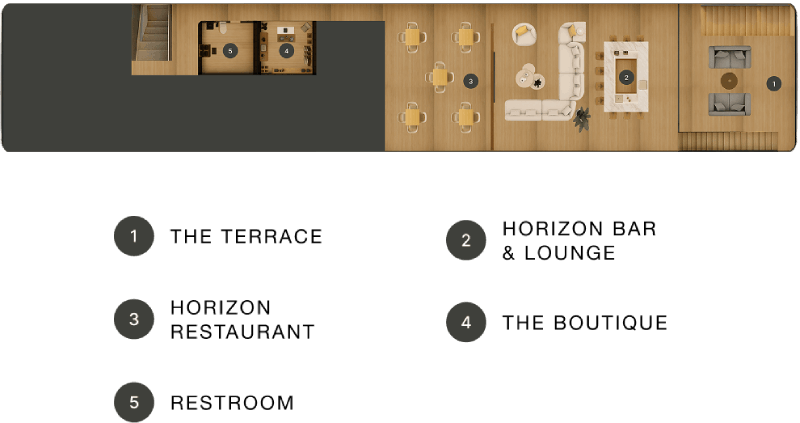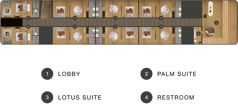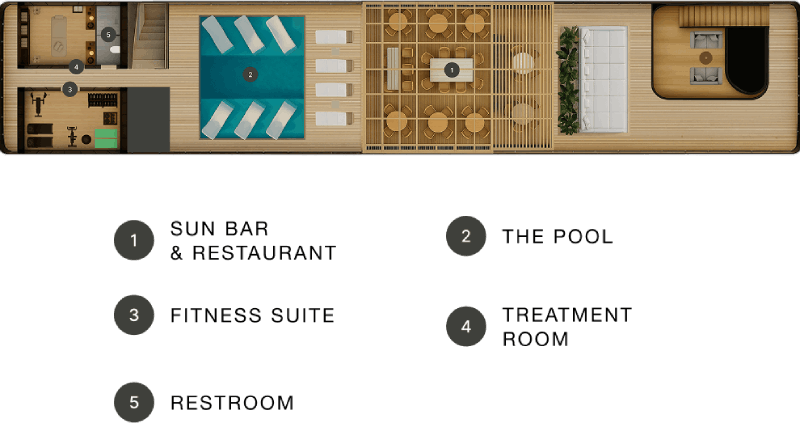 Discover quiet restoration on Nefertem’s Sun Deck, where the warmth of the day meets the cool embrace of the plunge pool. Expansive sunbeds, individual loungers, and an open bar create spaces to pause, reflect, and enjoy the stillness above the river.
