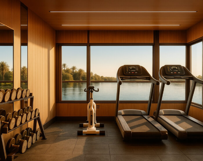 Wellness on Nefertem is shaped as a retreat within the journey—quiet, spacious, and open to the river. In the Therapy Room, treatments unfold at an unhurried pace, restoring balance with every touch. The Fitness Suite invites movement with intention, framed by light and views that extend beyond the water.